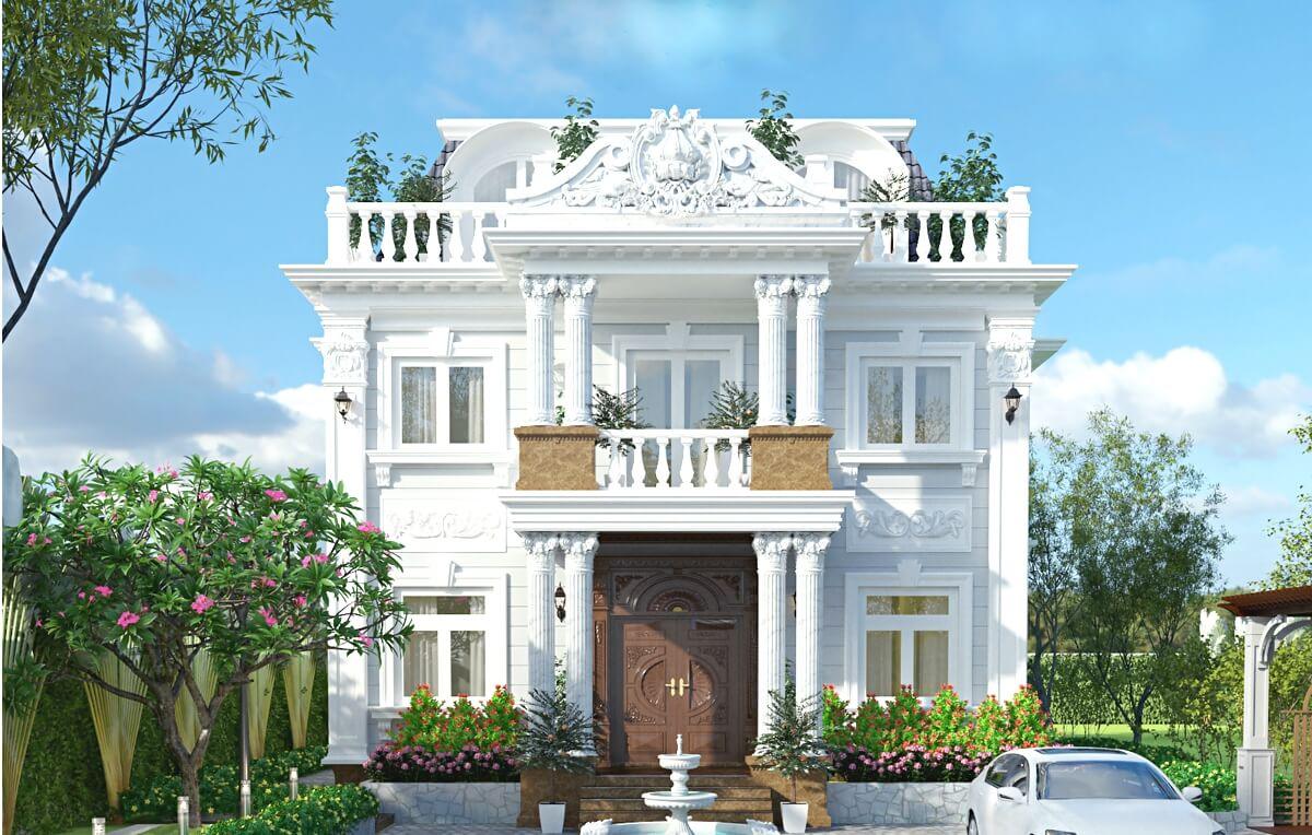 Thiết kế biệt thự 2 tầng phong cách cổ điển sang trọng với gam màu trắng nhẹ nhàng. Thay vì những họa tiết nặng nề ở ngôi nhà này việc lược bỏ bớt những hoa văn giúp ngôi nhà trở nên thanh thoát, kiêu sa hơn rất nhiều.