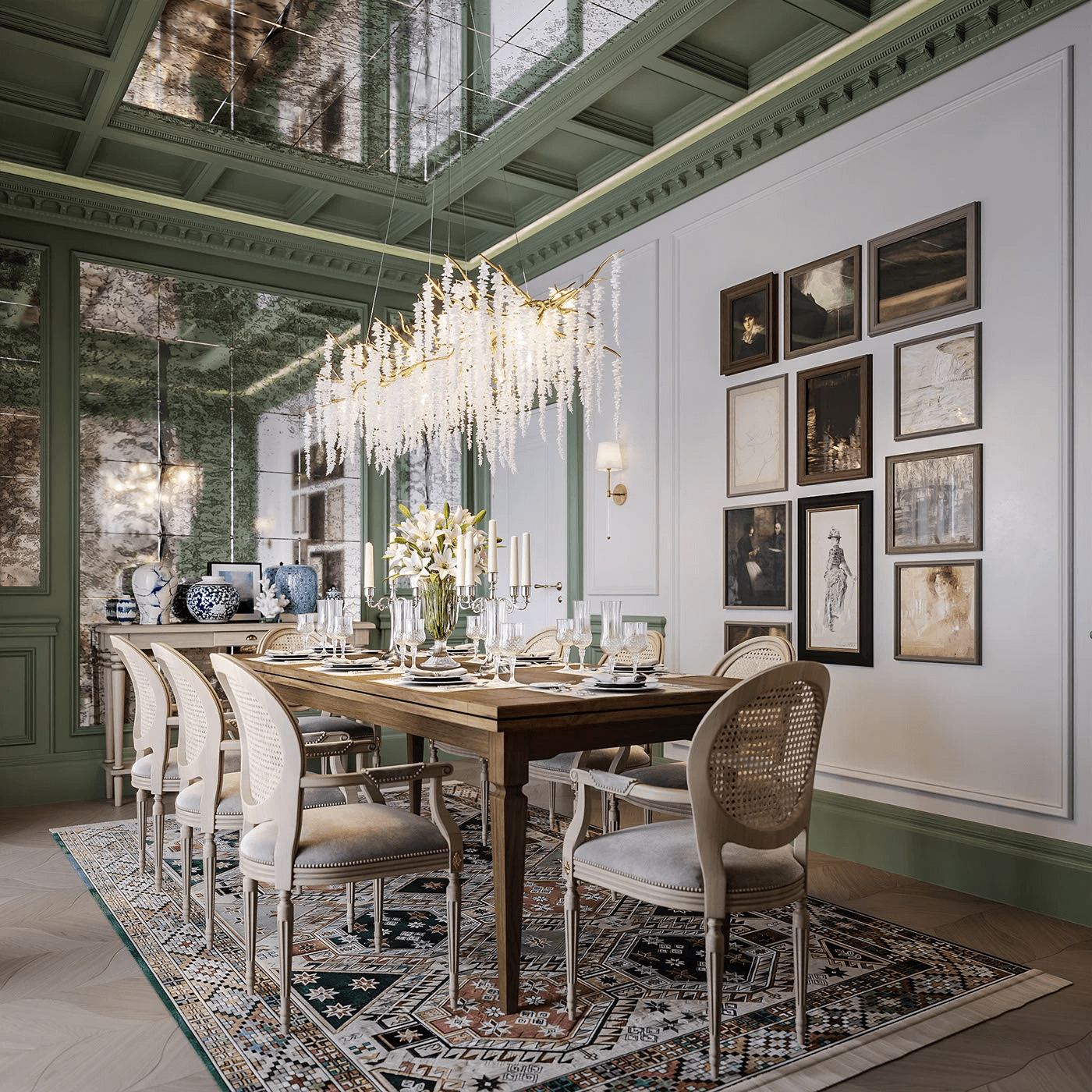 Phòng ăn lãng mạn, sang trọng hơn khi được đặt để gần cửa lớn giúp không gian thêm thoáng đãng, cũng chính vì thế mà việc sử dụng thảm trải sàn họa tiết, sơn tường màu xanh hay đèn chùm không làm cho không gian trở nên rối rắm.