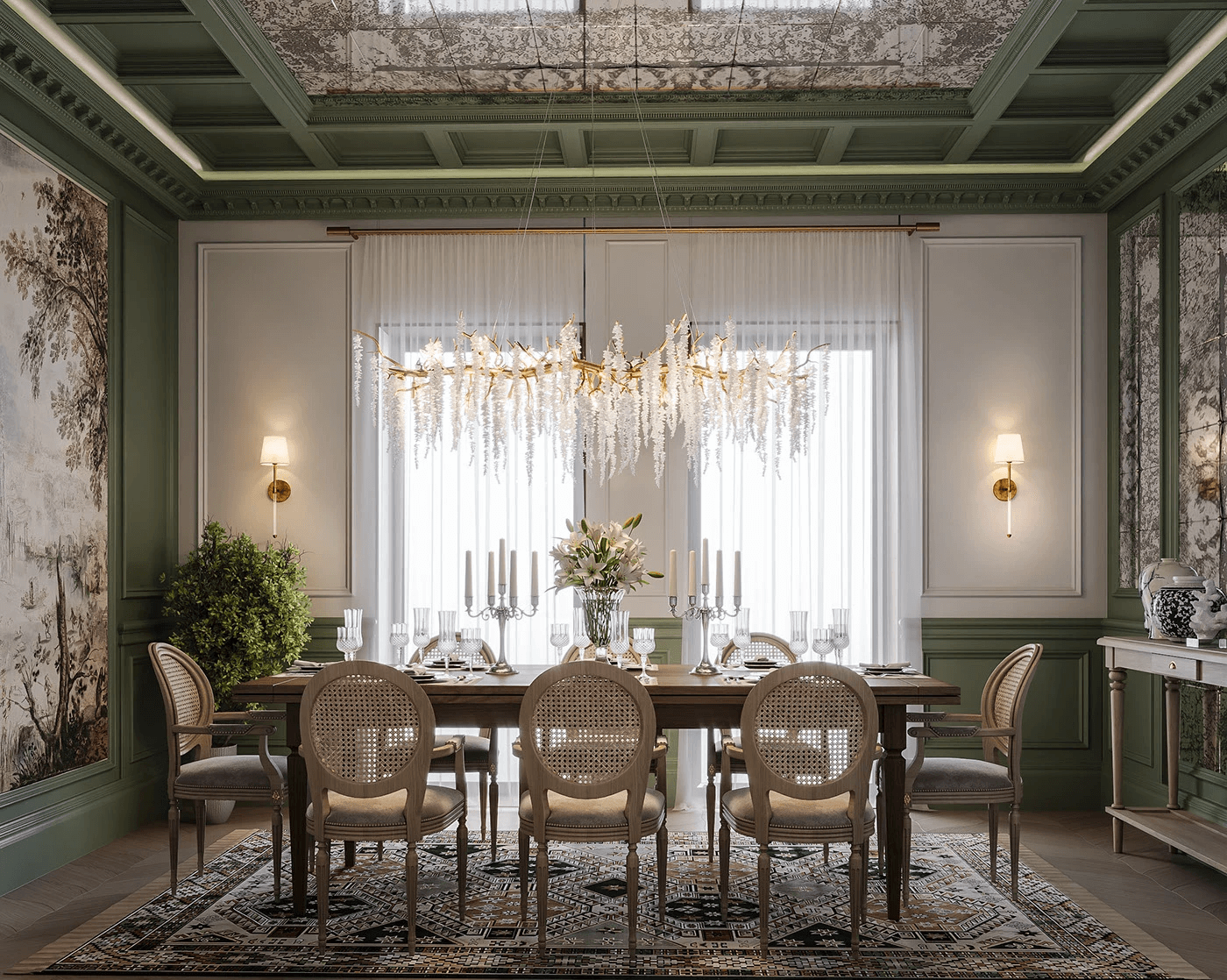 Phòng ăn biệt thự tân cổ điển kiểu Pháp được thiết kế với trần cao thoáng, điểm xuyết những đường phào chỉ tân cổ điển tinh tế. Tông màu xanh kết hợp cùng đèn chùm pha lê lộng lẫy không chỉ tăng thêm sự sang trọng mà còn mang lại cảm giác ấm cúng, quây quần.