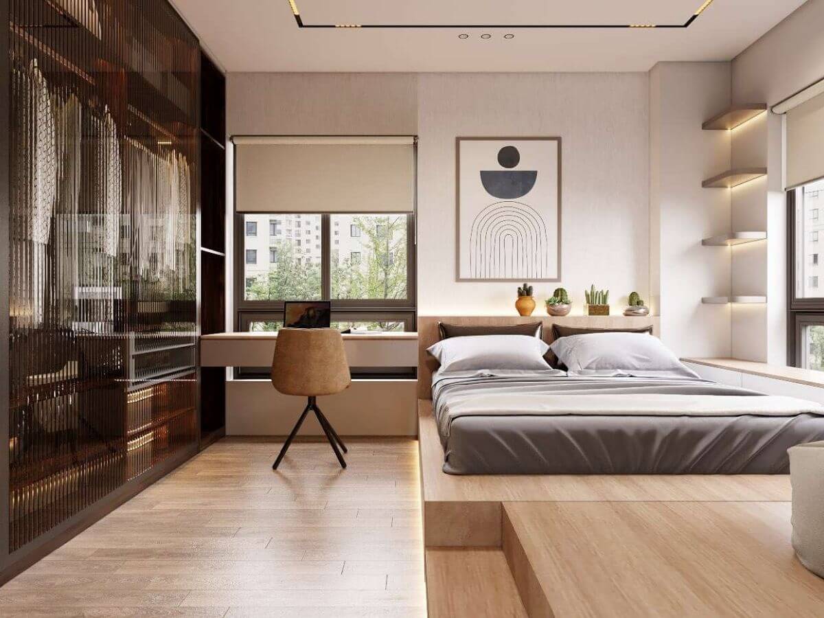 Thiết kế cửa sổ bằng nhôm kính xingfa màu trắng đen tạo nên sự tương phản cho toàn bộ kiến trúc căn phòng. Ở đây phòng ngủ đẹp với một view nhìn lý tưởng ra bên ngoài mà không cần đến mở cửa sổ. Đây là một trong những ưu điểm lớn nhất của chất liệu nhôm kính khi mang đến cái nhìn dễ dàng và không gian sang trọng hơn rất nhiều.