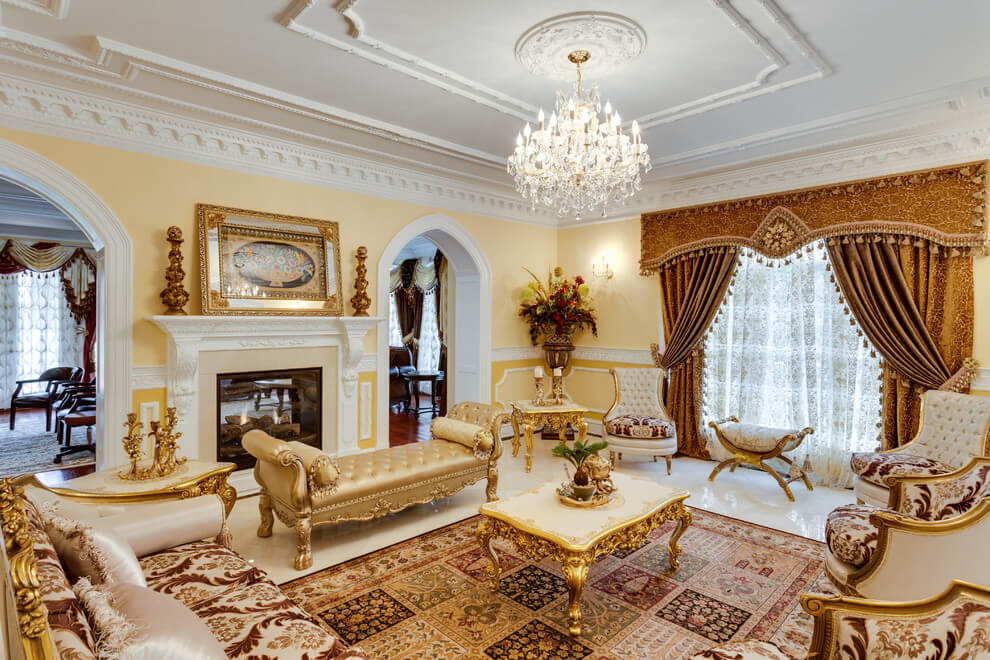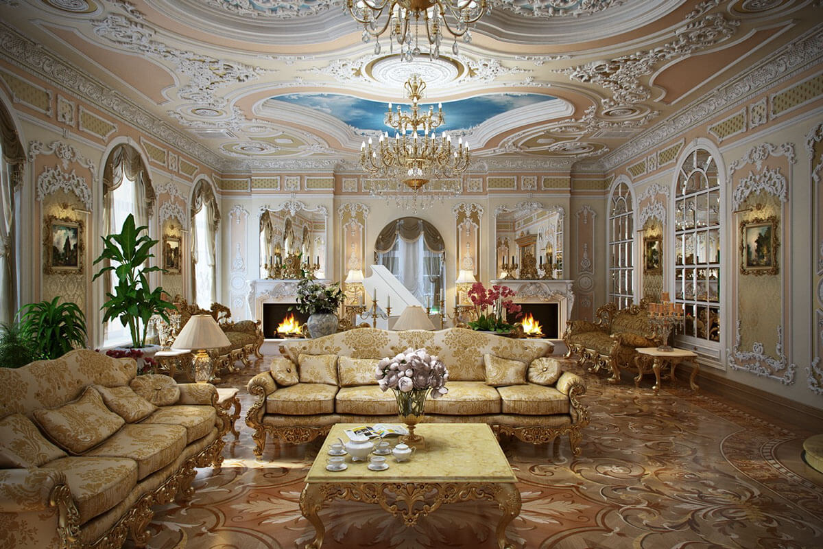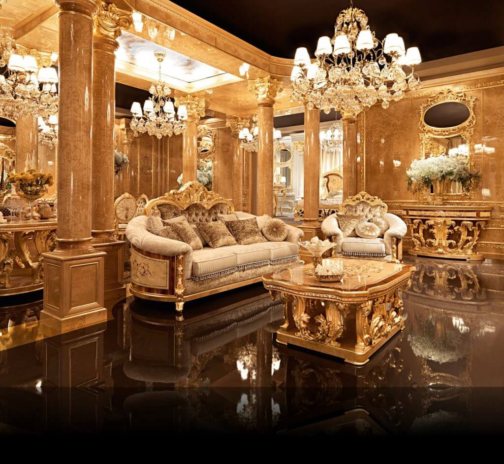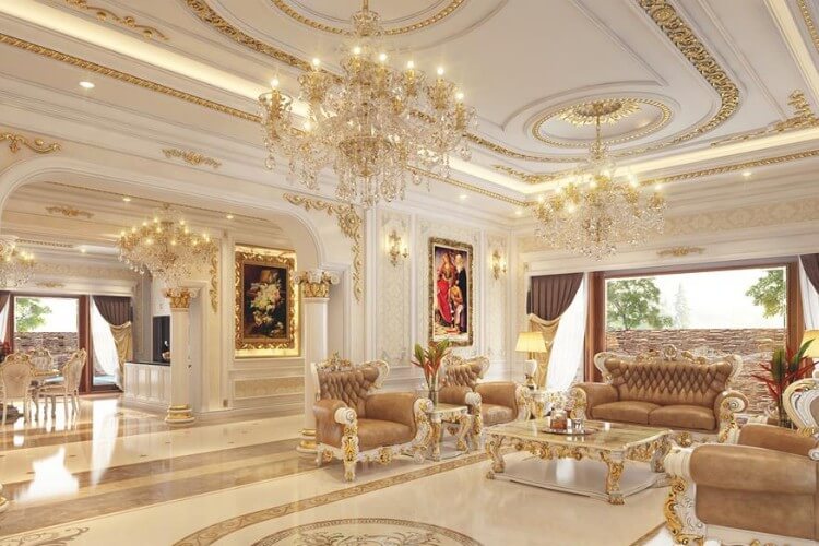 - Các nội thất phòng khách được chạm khắc cầu kỳ thủ công với những hoa văn họa tiết mang tính nghệ thuật ca. Thông thường những nội thất luôn có kích thước lớn tương xứng với toàn bộ không gian. Trang trí nội thất điêu khắc bằng vàng cũng được cho là phù hợp.