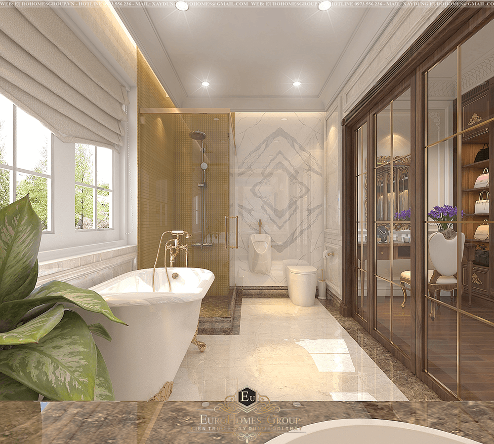 Phòng tắm trong biệt thự 2 tầng được thiết kế như một không gian thư giãn riêng tư, tiện nghi và rộng thoáng.