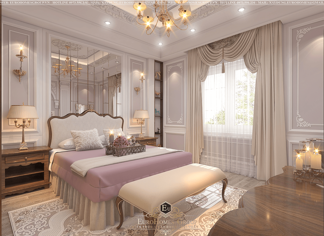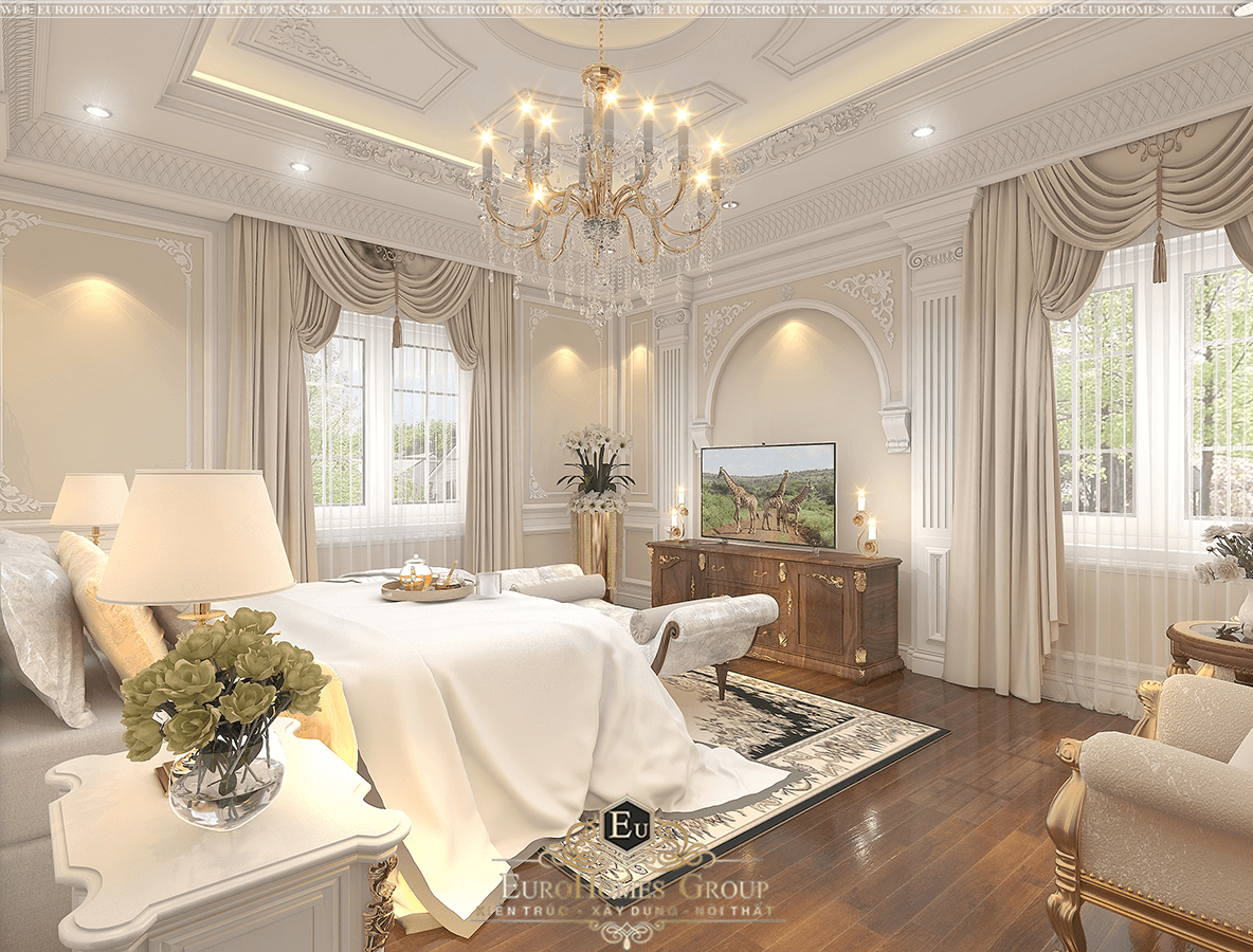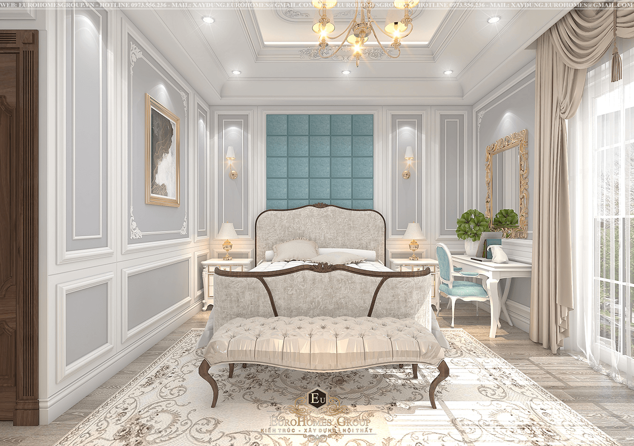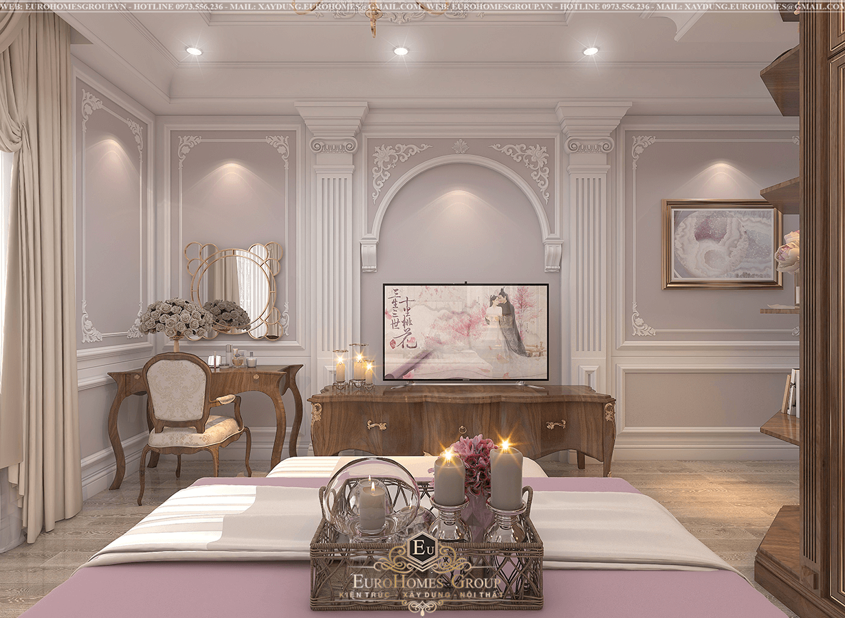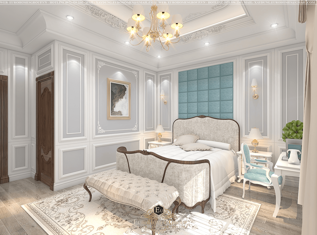 Phòng ngủ trong biệt thự 2 tầng 3 gian được thiết kế theo phong cách tân cổ điển với bố cục gọn gàng, ấm cúng và tiện nghi.