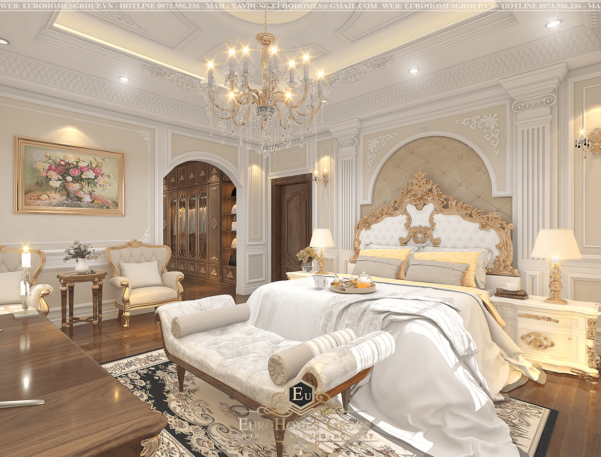 Giường ngủ gỗ cao cấp chạm khắc tinh xảo kết hợp cùng ga nệm mềm mại mang đến cảm giác thư thái tuyệt đối. Gam màu nhẹ nhàng, điểm xuyết bởi hệ phào chỉ tinh tế trên tường và trần, tạo nên không gian sang trọng nhưng vẫn gần gũi.