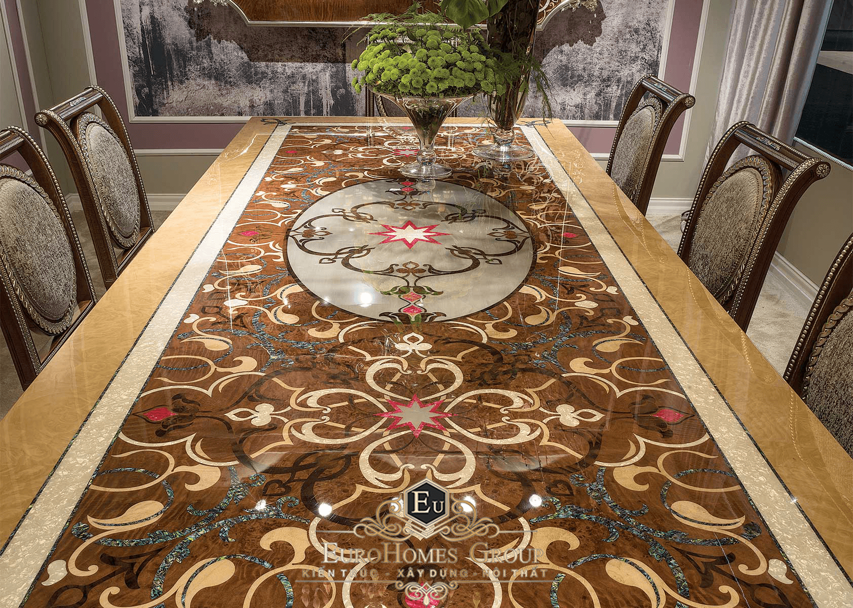 Sản phẩm ngoài việc được làm bằng chất liệu cao cấp thì mặt bàn với nghệ thuật ghép tranh gỗ độc đáo tạo nên đa sắc màu vô cùng ấn tượng kết hợp cùng những chiếc ghế bọc da hoặc nỉ sang trọng, đường nét uốn lượn mềm mại và chi tiết chạm khắc thủ công đầy tinh xảo. Từng đường chỉ, từng tỷ lệ đều được tính toán kỹ lưỡng, tạo nên cảm giác vững chãi nhưng vẫn thanh thoát.
