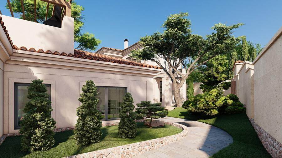 Thiết kế sân vườn biệt thự phong cách Địa Trung hải gắn liền với nét đẹp mộc mạc, chân thực gần gũi với thiên nhiên nhất. Được xây dựng từ những vật liệu thô mộc như đá, gỗ, gạch được sắp xếp hợp lý cảm nhận được sự yên bình, có phần lãng mạn. Cây xanh được sử dụng hết sức đa dạng và phong phú, đặc biệt là hoa rất nhiều màu sắc sặc sỡ.