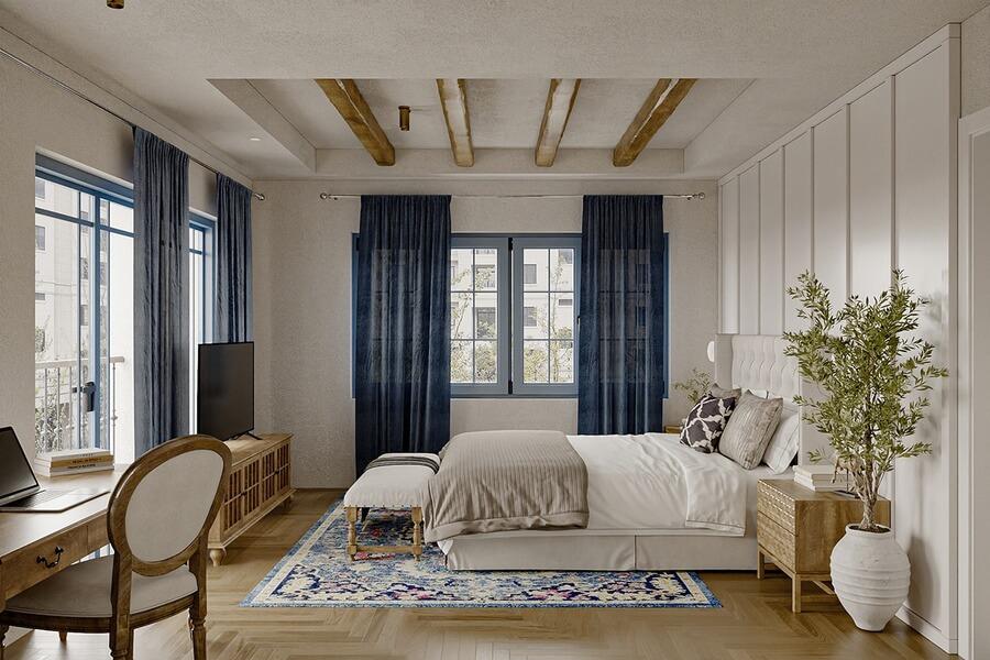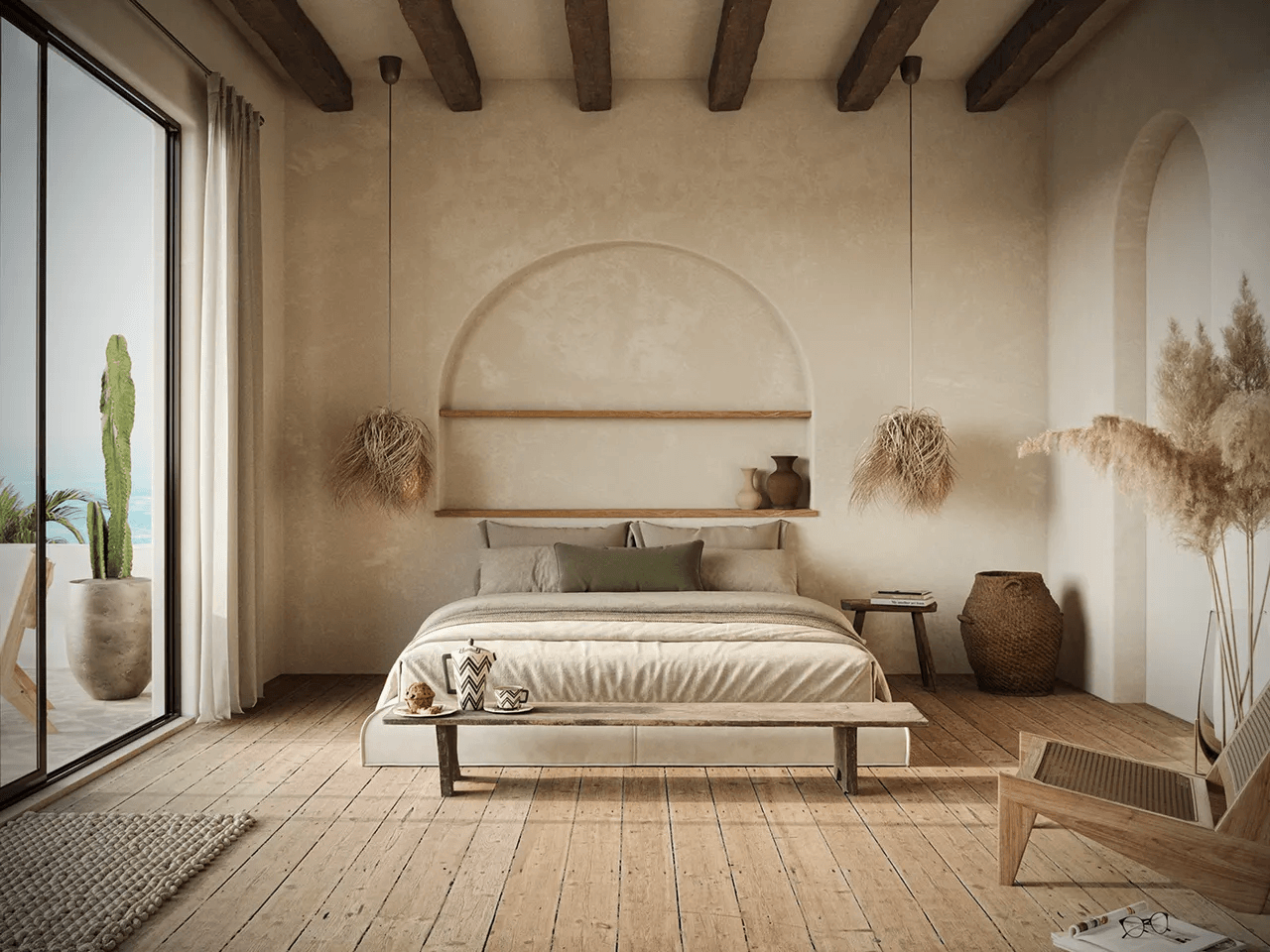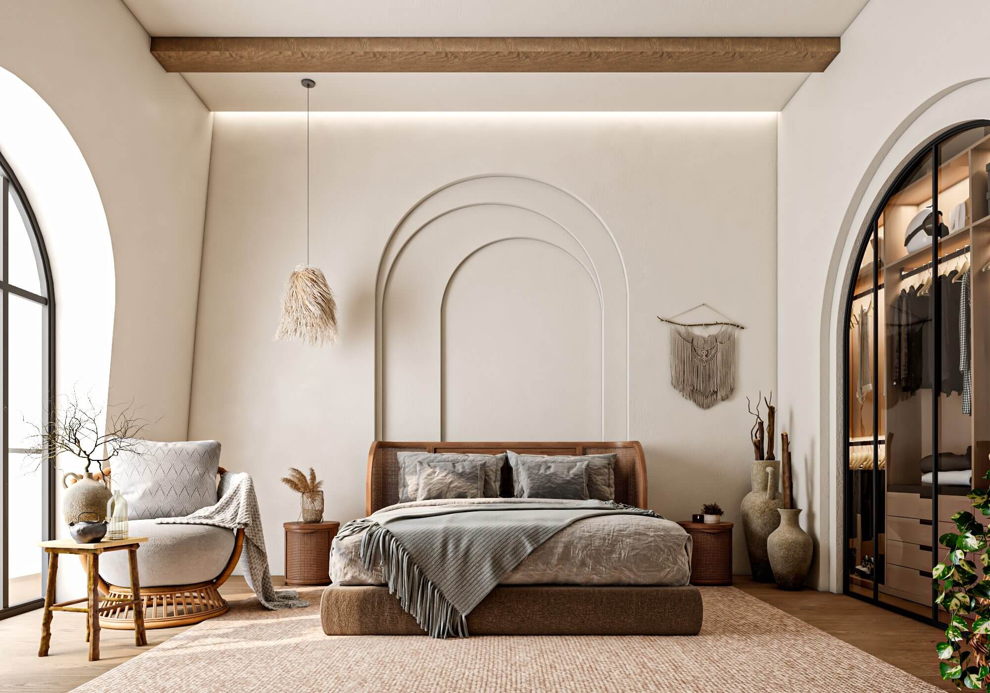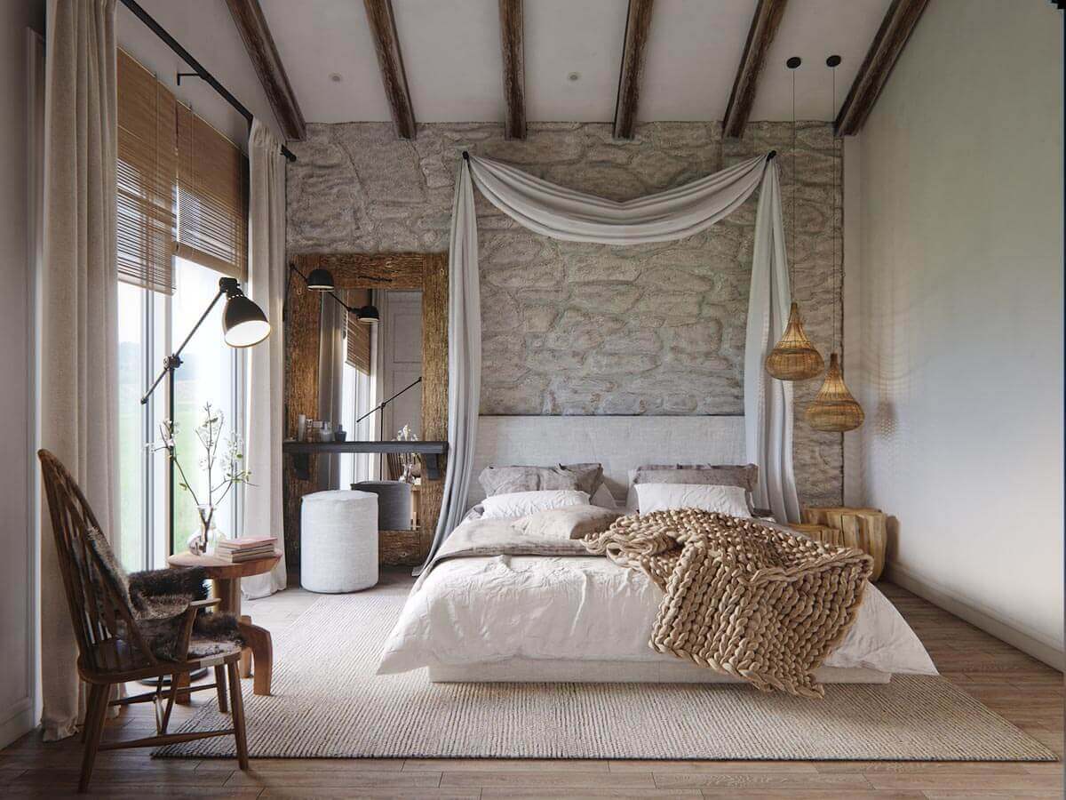 Thiết kế nội thất phòng ngủ phong cách Địa Trung Hải cũng được nhiều người yêu thích bởi nét đẹp nhẹ nhàng, sang trọng nhưng cộng hưởng nét mộc mạc với chất liệu gỗ tự nhiên, đá bên cạnh đó là những đường nét uốn cong từ nội thất hay những chạm trổ hoa văn với nét đẹp nhẹ nhàng.
