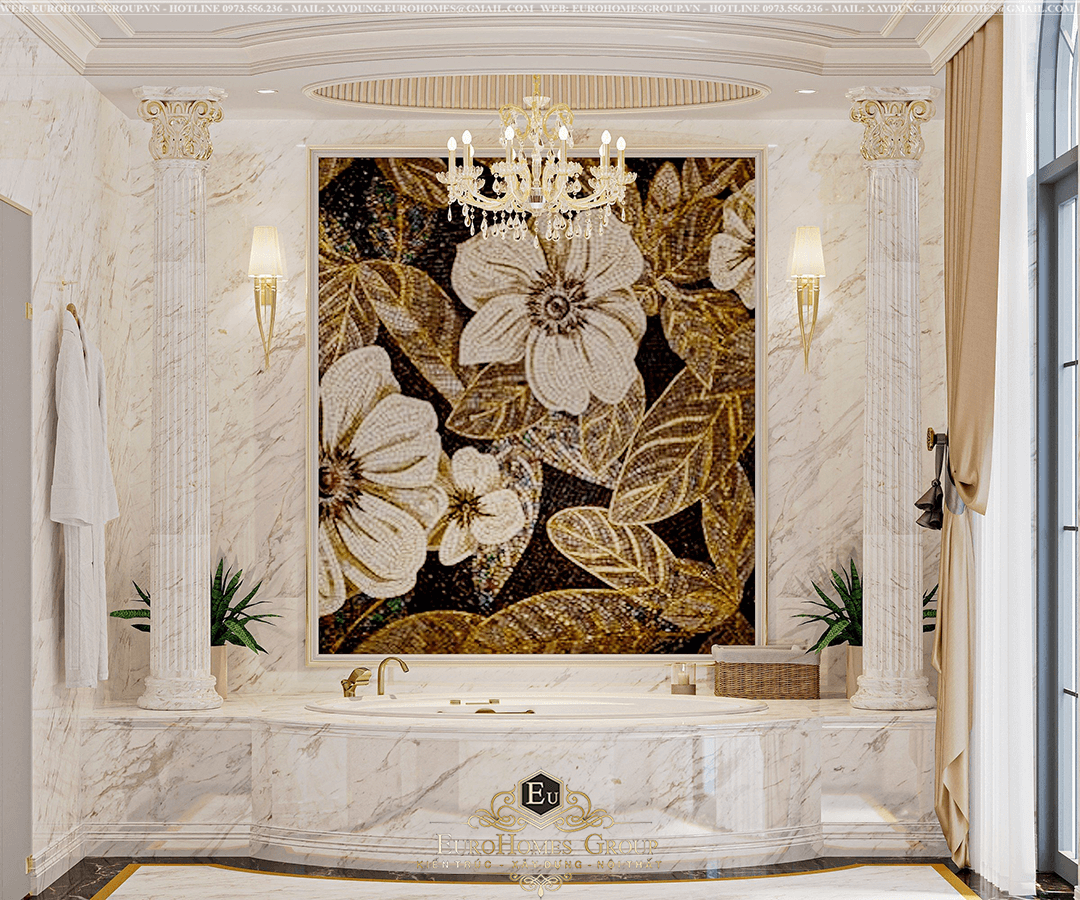 Toàn bộ tường và sàn được ốp đá cao cấp kết hợp với gạch mosaic cao cấp làm điểm nhấn tạo hiệu ứng ánh sáng lung linh khi phản chiếu dưới ánh đèn, khiến không gian trở nên vừa ấm áp vừa quý phái.