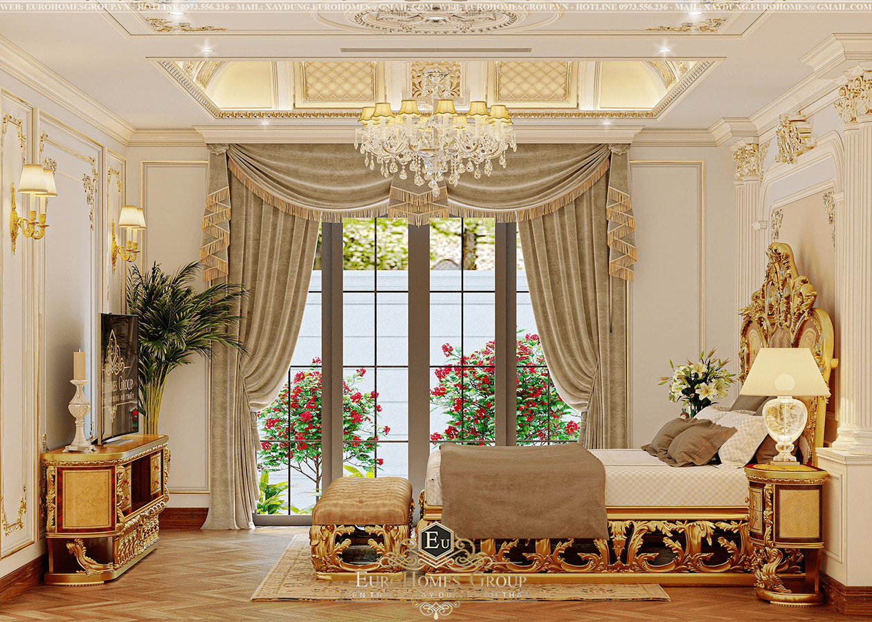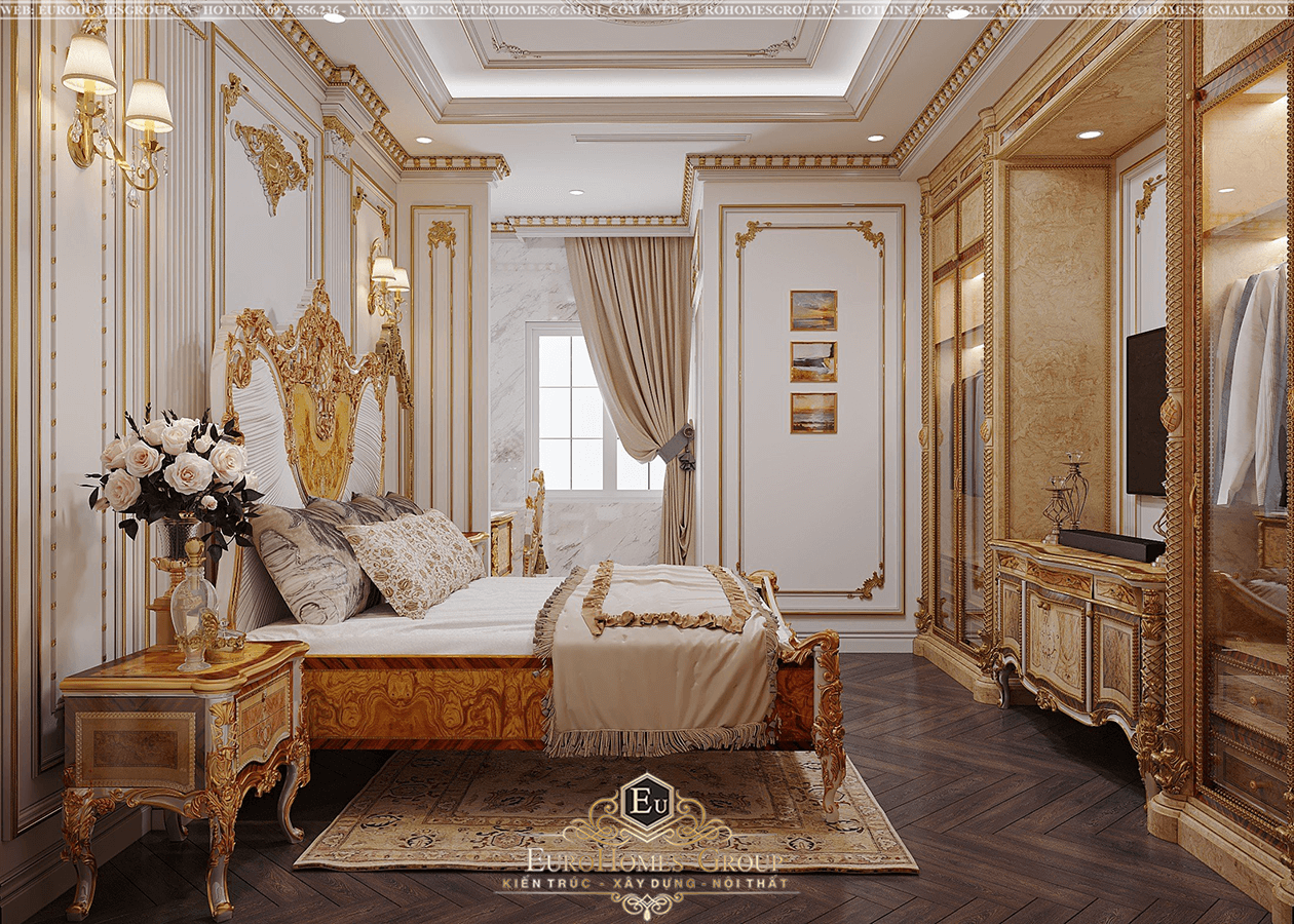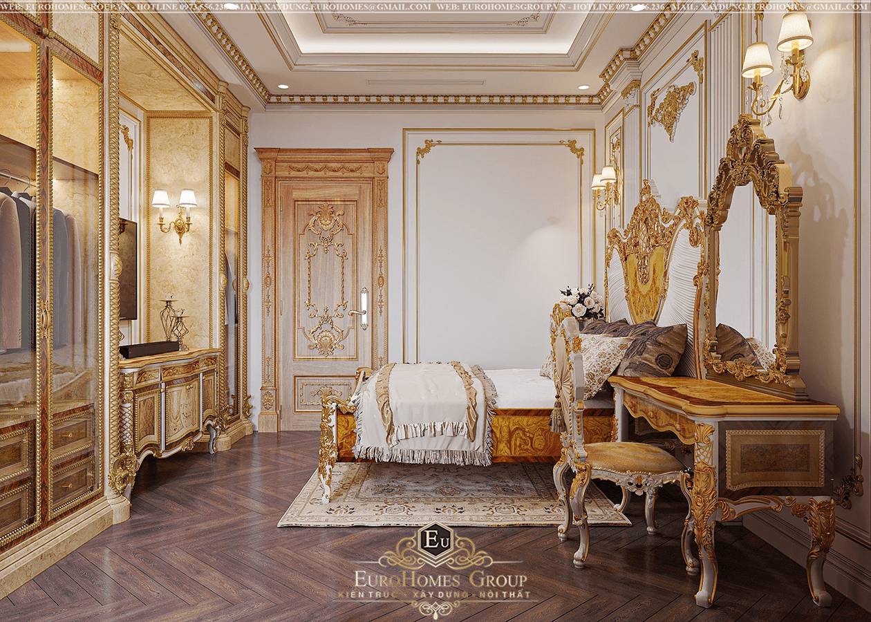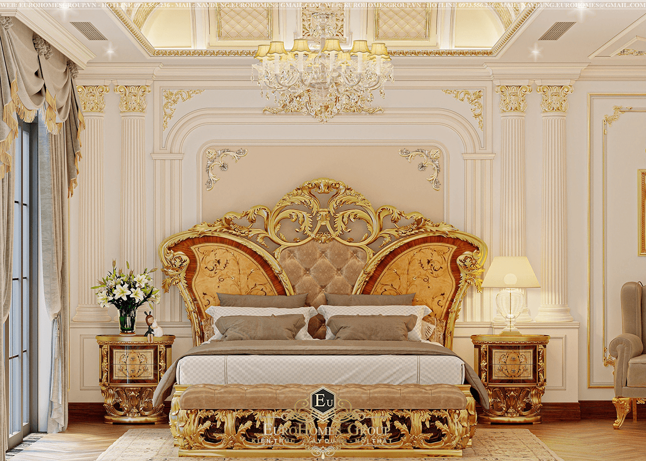 Một thiết kế nội thất phòng ngủ khác cũng đầy sang trọng và đẳng cấp với nội thất tân cổ điển dát vàng cao cấp. Từng chi tiết được chạm khắc tinh xảo cộng hưởng thêm hoa văn cầu kỳ đậm chất hoàng gia châu Âu.
