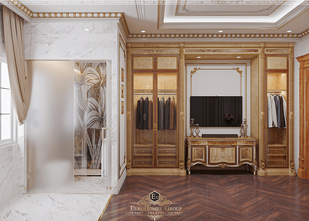 Tủ quần áo, bàn trang điểm và rèm cửa đều được thiết kế đồng bộ về kiểu dáng và màu sắc, giúp tổng thể căn phòng hài hòa, chuẩn mực. Mỗi chi tiết, dù nhỏ nhất, đều thể hiện sự trau chuốt và gu thẩm mỹ tinh tế mang phong cách tân cổ điển châu Âu sang trọng.