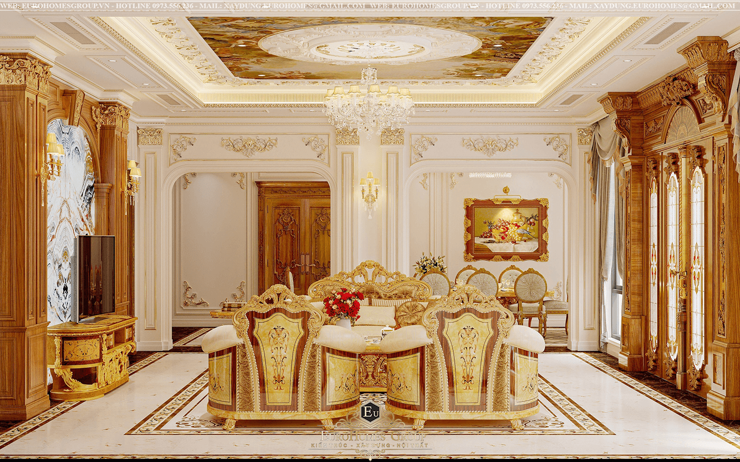 Phòng khách biệt thự 1 tầng tân cổ điển châu Âu đẹp