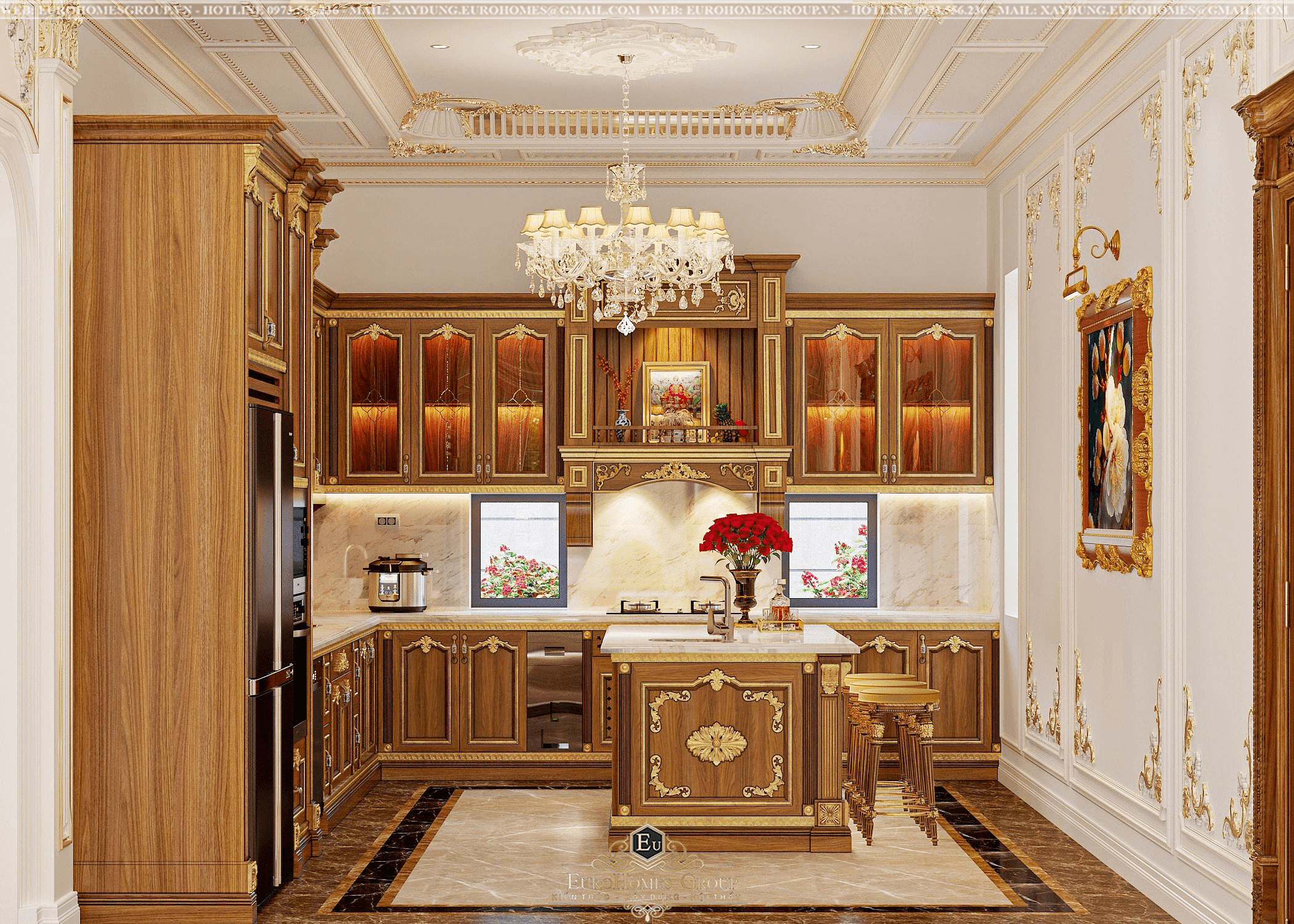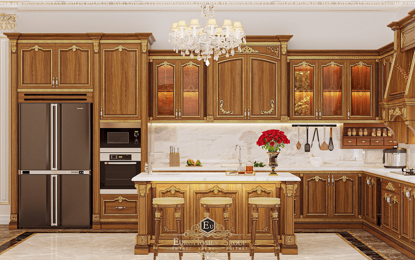 Tủ bếp được chế tác hoàn toàn từ gỗ tự nhiên, phủ sơn bóng sang trọng, nổi bật với những đường nét chạm khắc tinh xảo trên cánh tủ thể hiện rõ phong cách tân cổ điển đậm chất châu Âu.