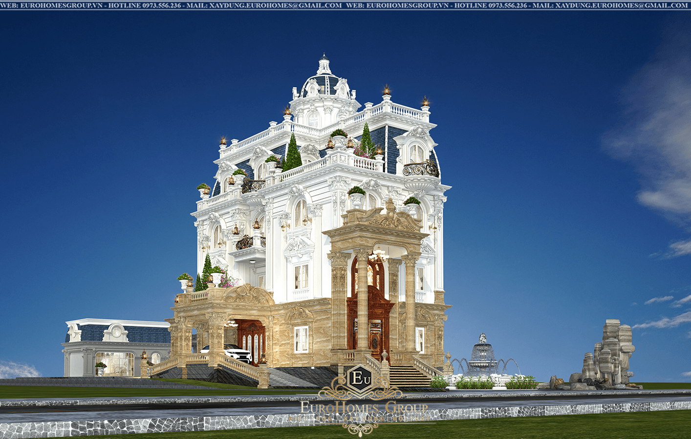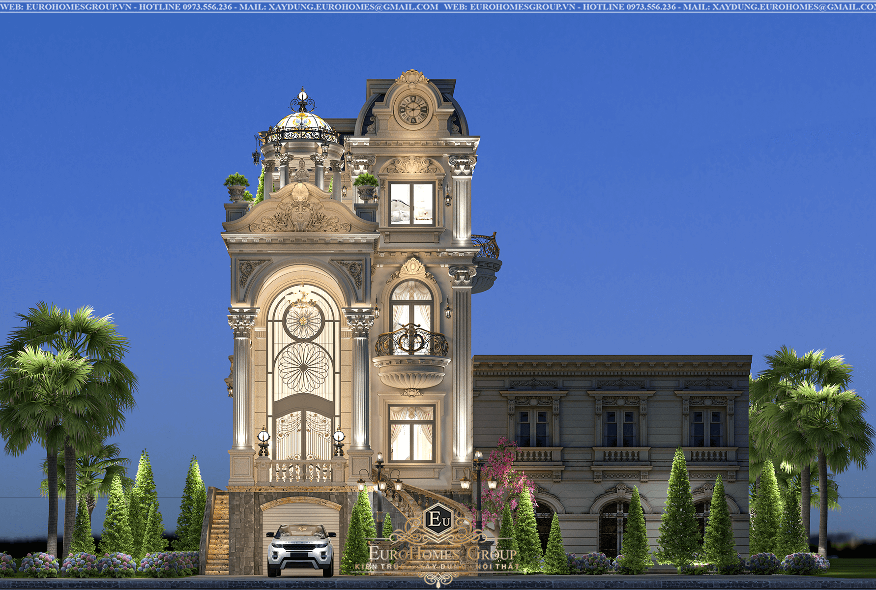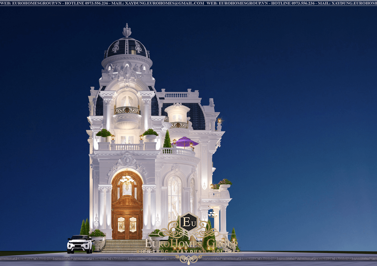 Toàn bộ kiến trúc được tổ chức theo bố cục đăng đối, đường nét rõ ràng, tôn lên sự uy nghi của một công trình mang phong cách châu Âu đẳng cấp.