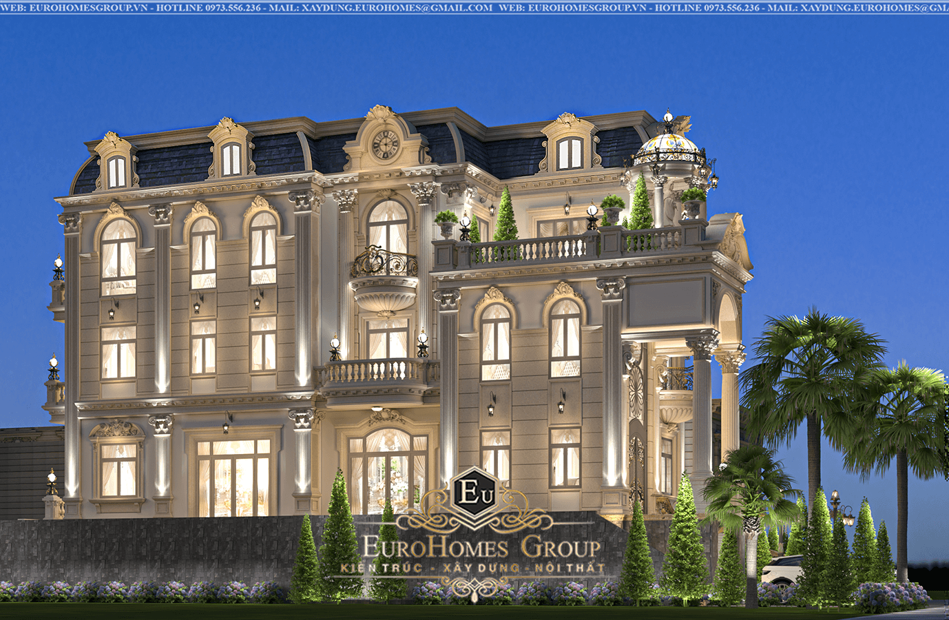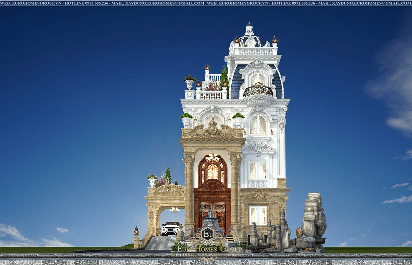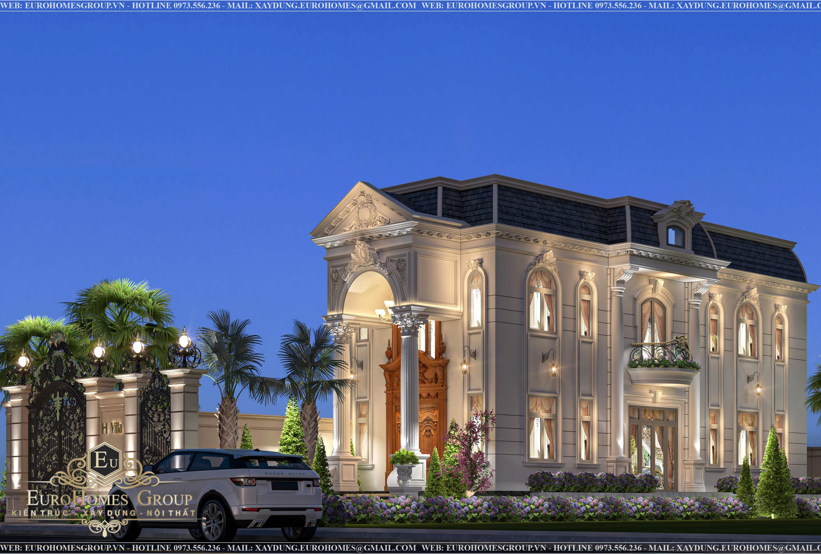 Mái mansard kết hợp cùng mái vòm được trang trí bằng các hoa văn phù điêu tinh xảo, vừa mềm mại vừa uy nghi, làm nổi bật phong cách châu Âu cổ điển hiện đại. Mặt tiền công trình cân đối, với các cột trụ kết hợp cùng cửa chính gỗ tự nhiên cao cấp nhằm nâng tầm kiến trúc biệt thự.