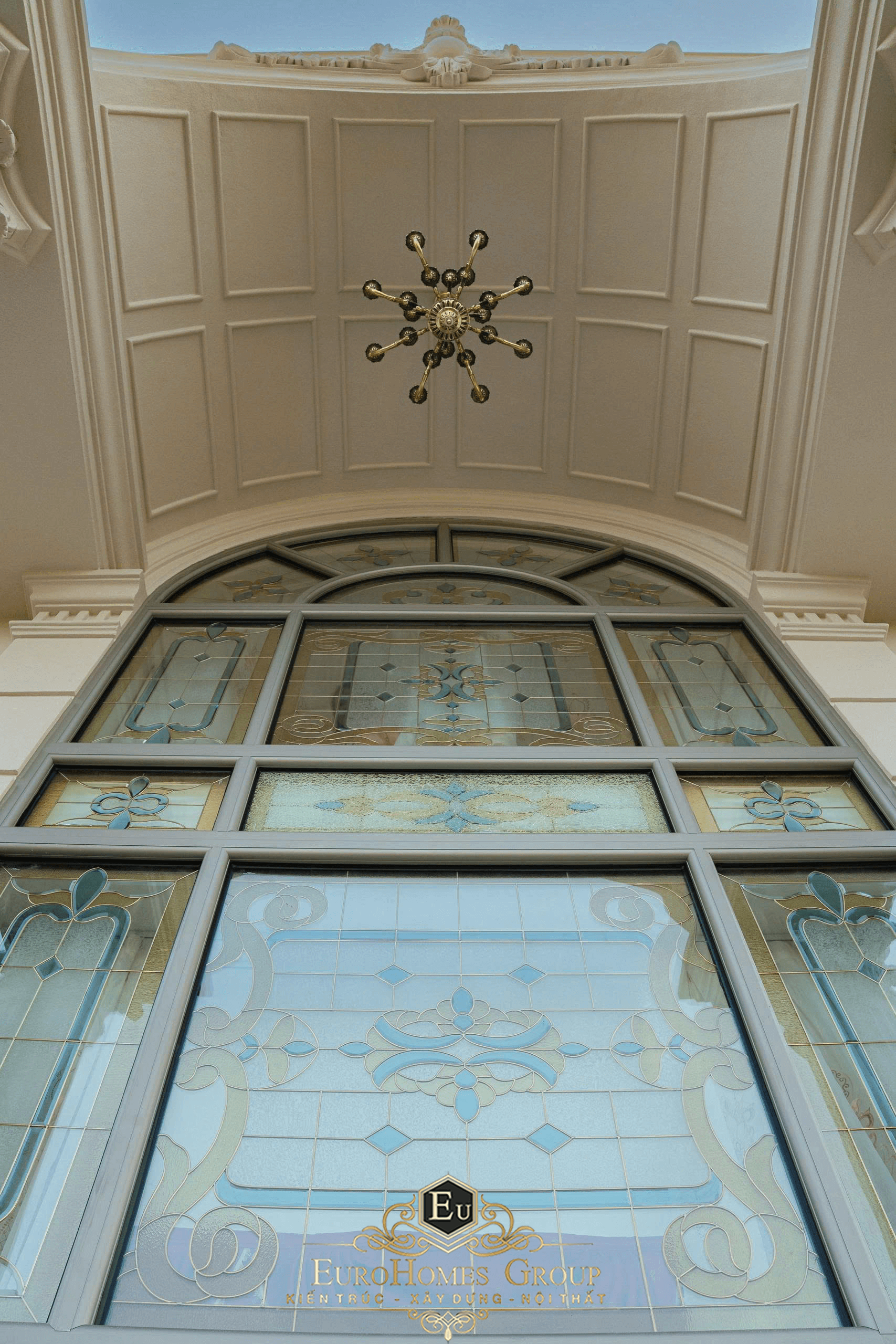 Cửa kính hoa đồng được kết hợp để vừa đón ánh sáng từ bên ngoài vào trong vừa đảm bảo tính thẩm mỹ, nghệ thuật phù hợp với kiến trúc tân cổ điển.